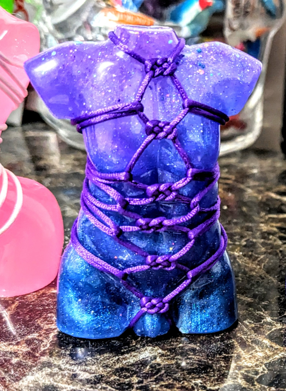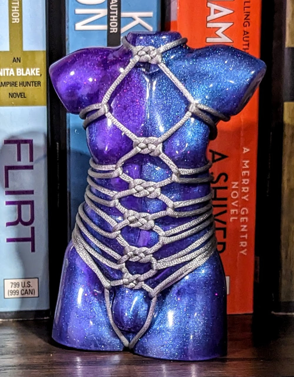 You can have your figurine tied in a decorative rope harness, or without rope to come as a nude, unbound torso. If you would like a bound figurine, there are currently 13 rope color options, and the ties now come with my signature decorative rope ring collars. If you do NOT want it to come tied with the rope collar, check the box.