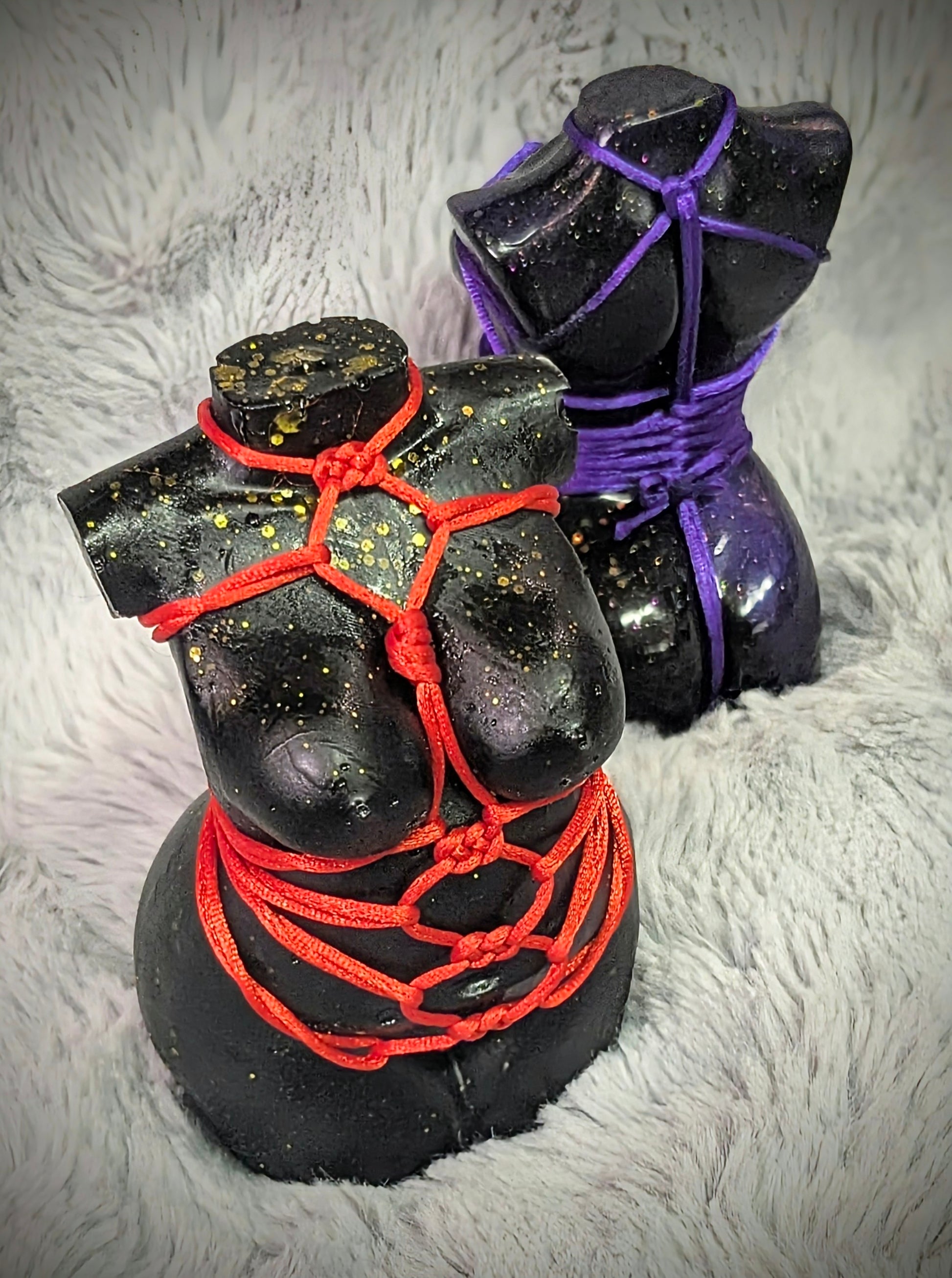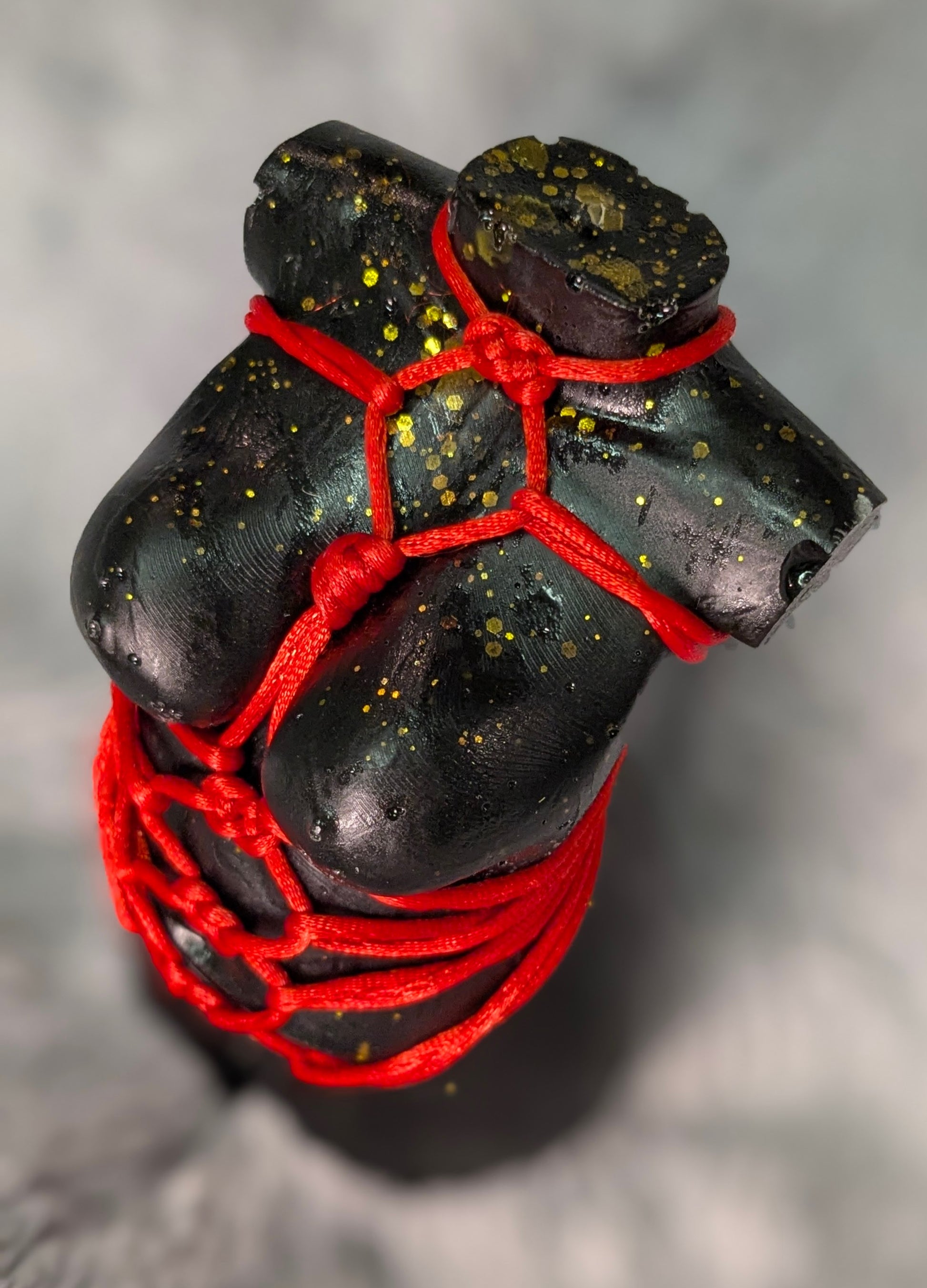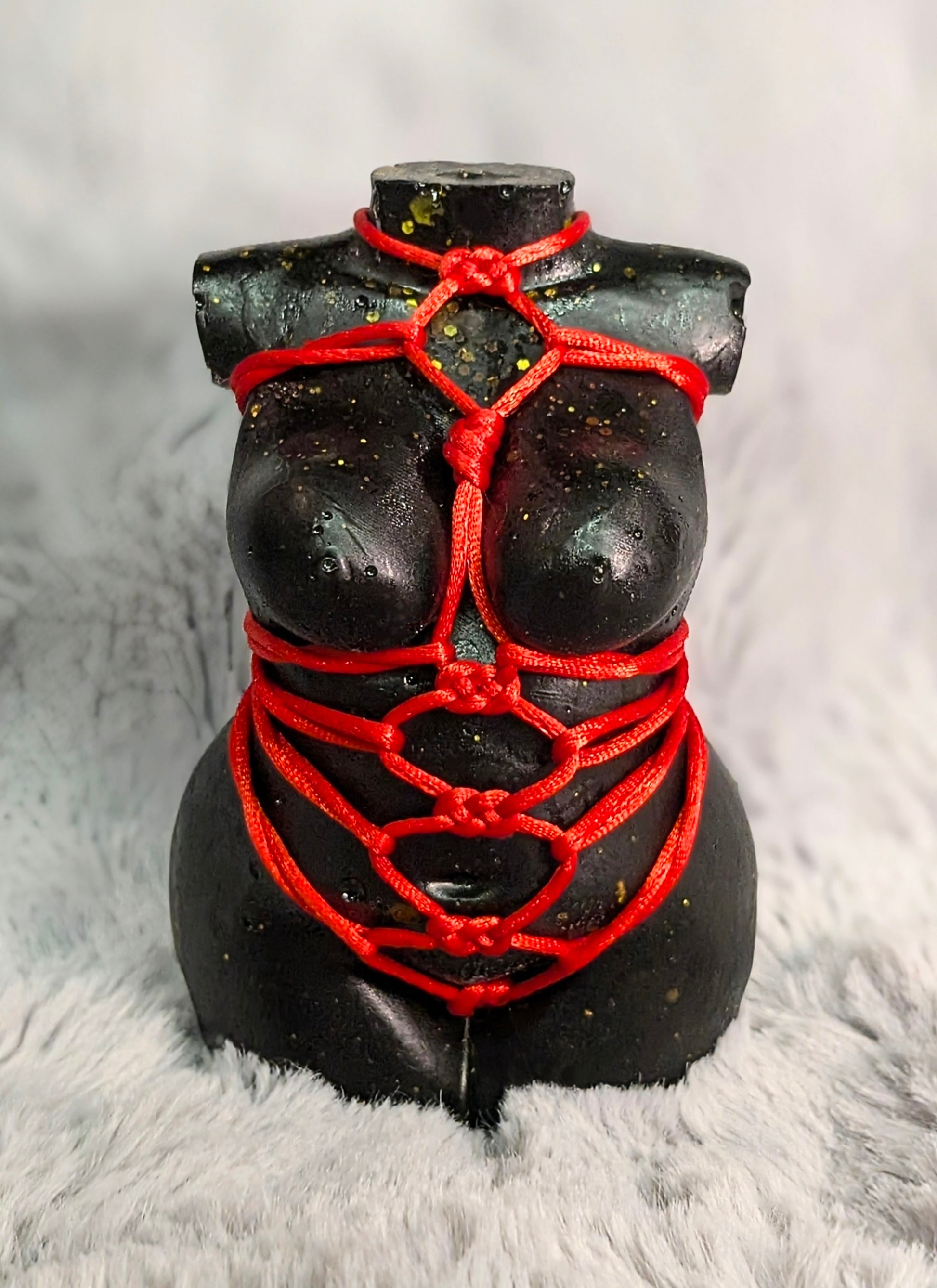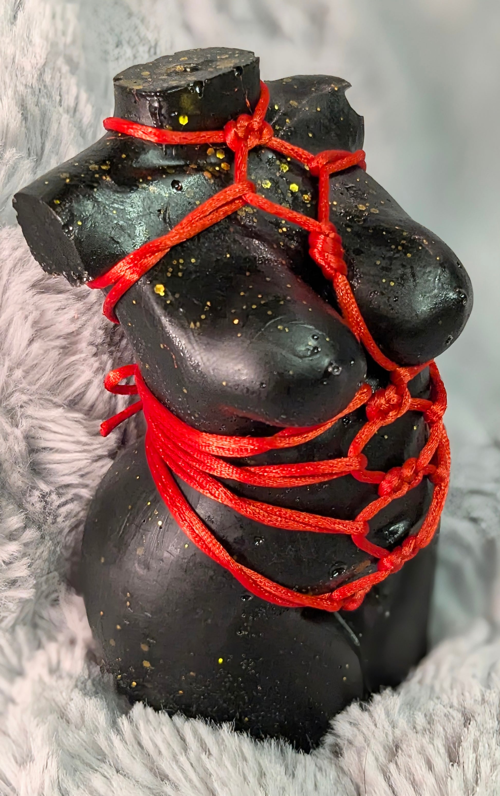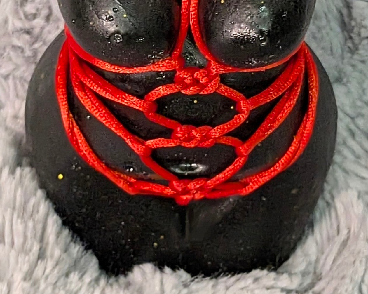 You can have your figurine tied in a decorative rope harness, or without rope to come as a nude, unbound torso. If you would like a bound figurine, there are currently 13 rope color options, and the ties now come with my signature decorative rope ring collars. If you do NOT want it to come tied with the rope collar, check the box.