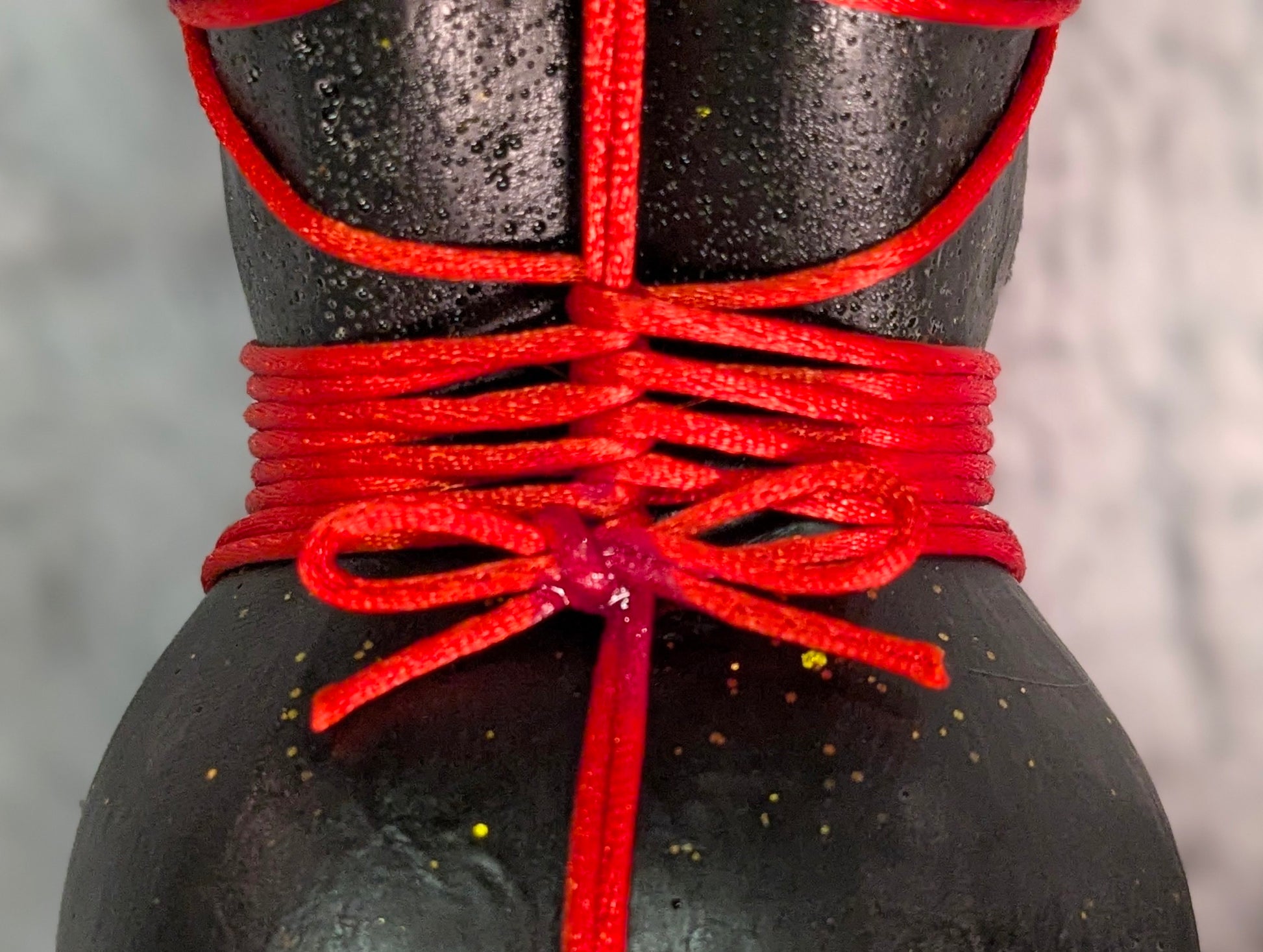 This kNotorious Clover bound figurine is made & ready to ship. The figurine is black with subtle red glitter. The rope is red & the tie style name is The Special K[arada]. Red & Black for that sexy, playful dungeon vibe.