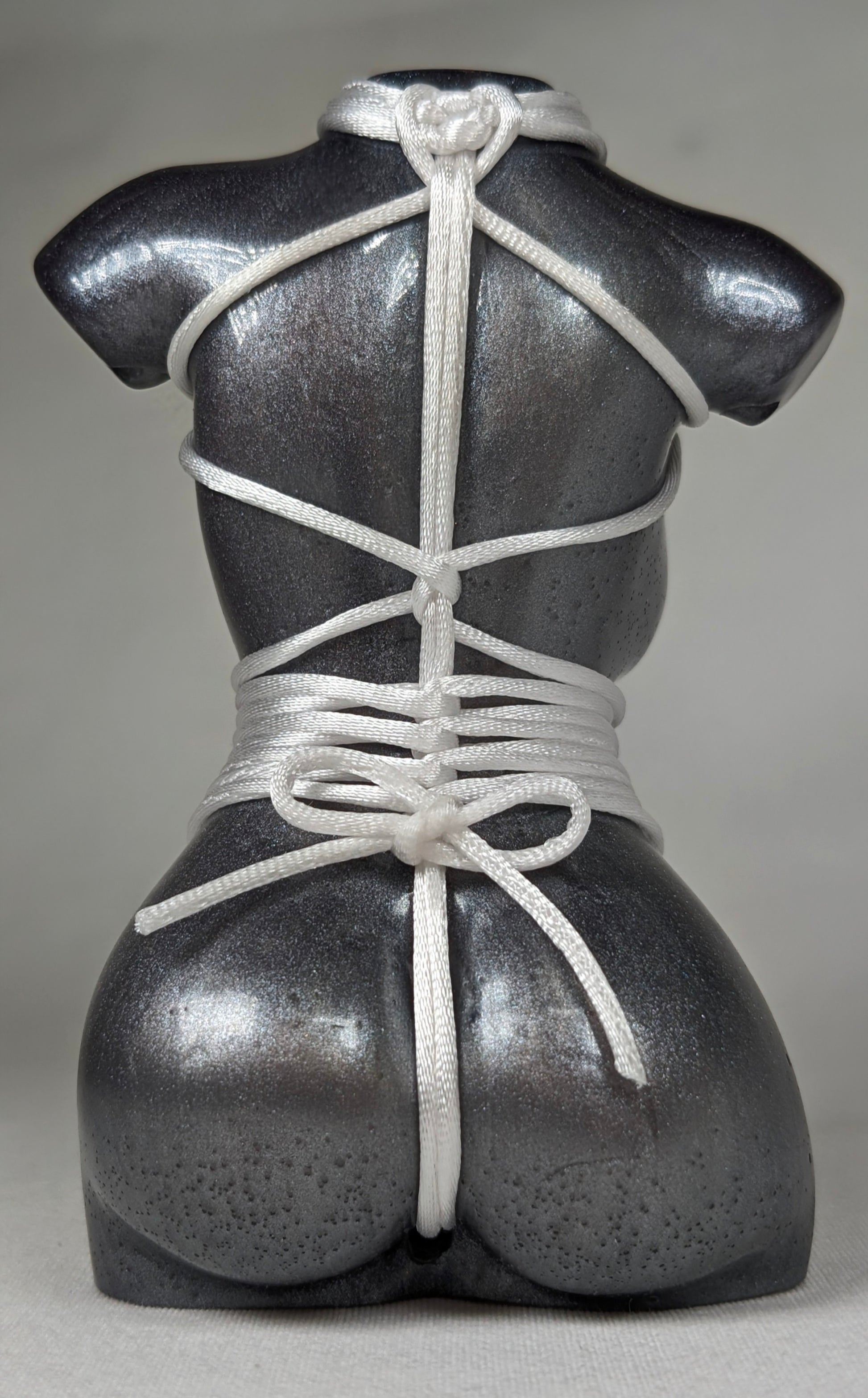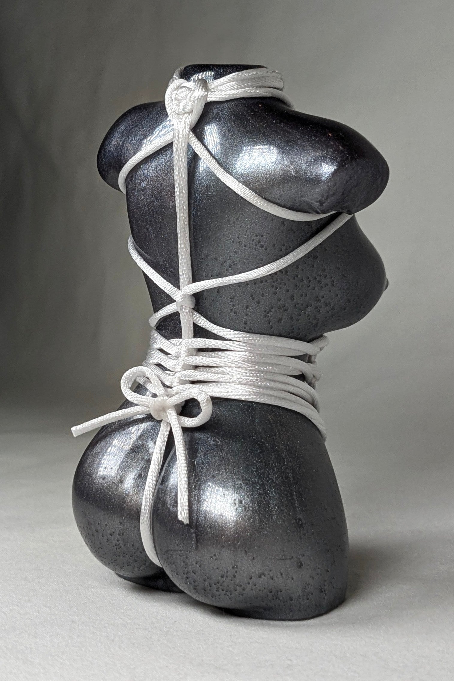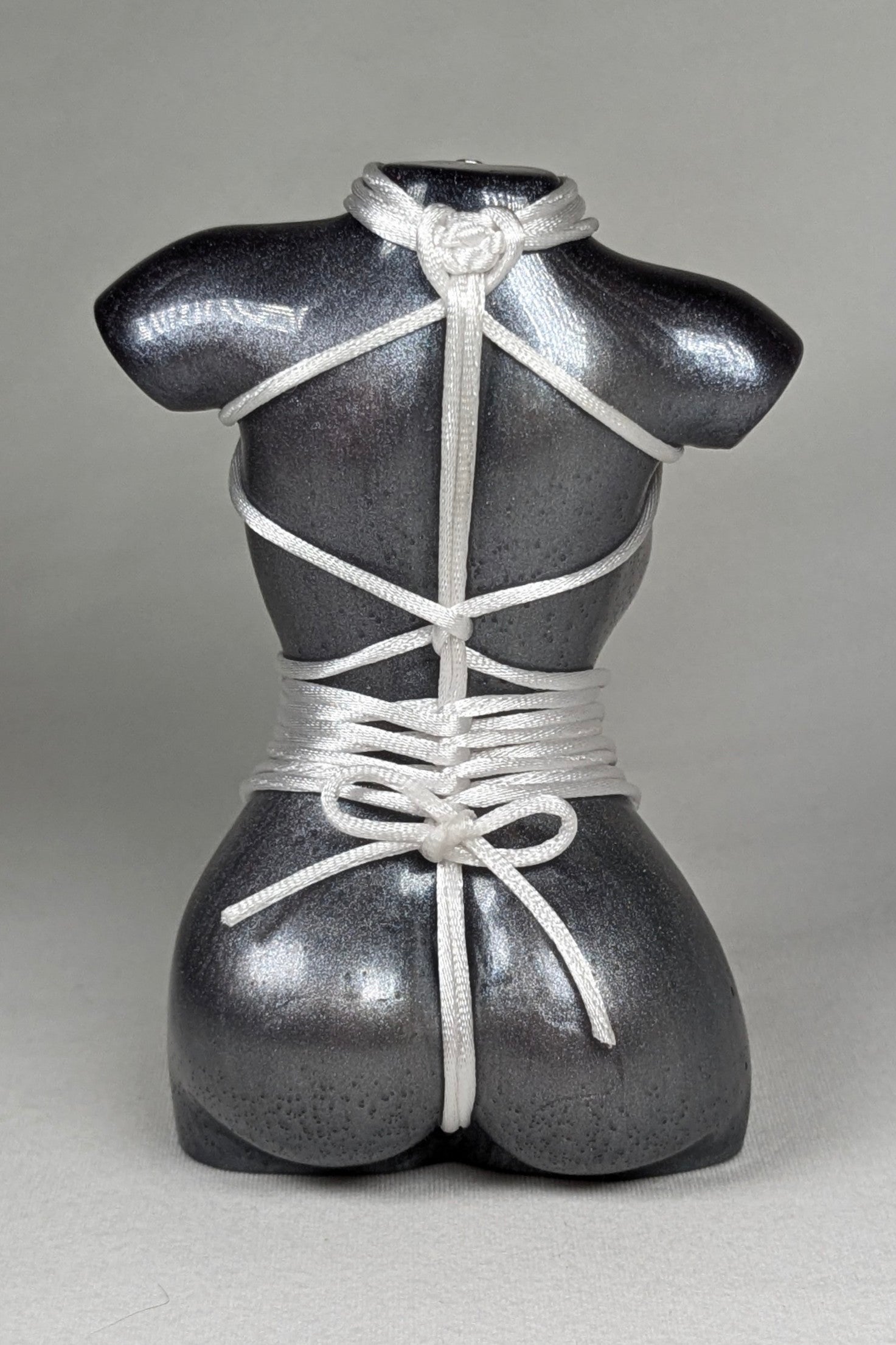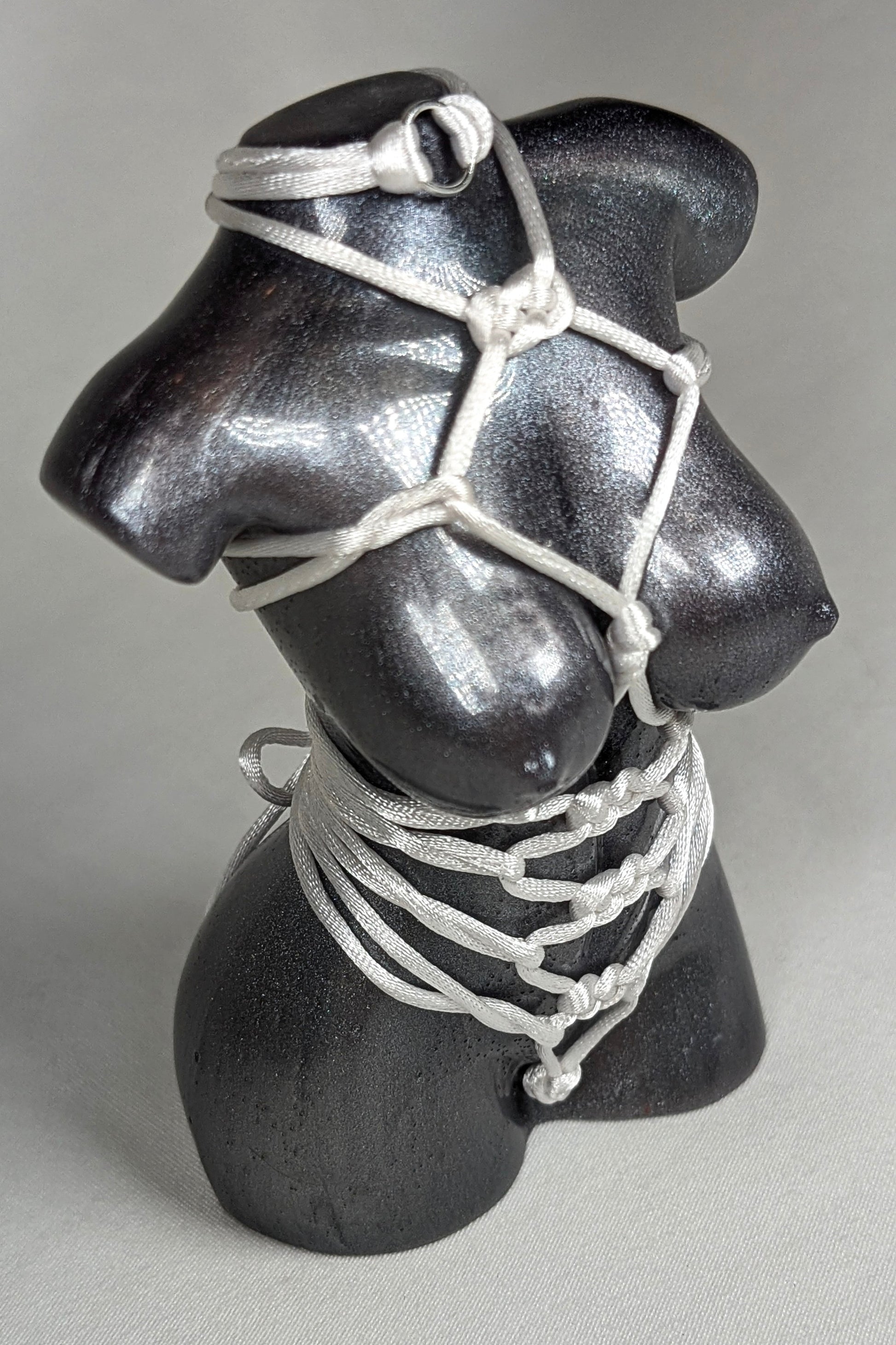 You can have your figurine tied in a decorative rope harness, or without rope to come as a nude, unbound torso. If you would like a bound figurine, there are currently 13 rope color options, and the ties now come with my signature decorative rope ring collars. If you do NOT want it to come tied with the rope collar, check the box.