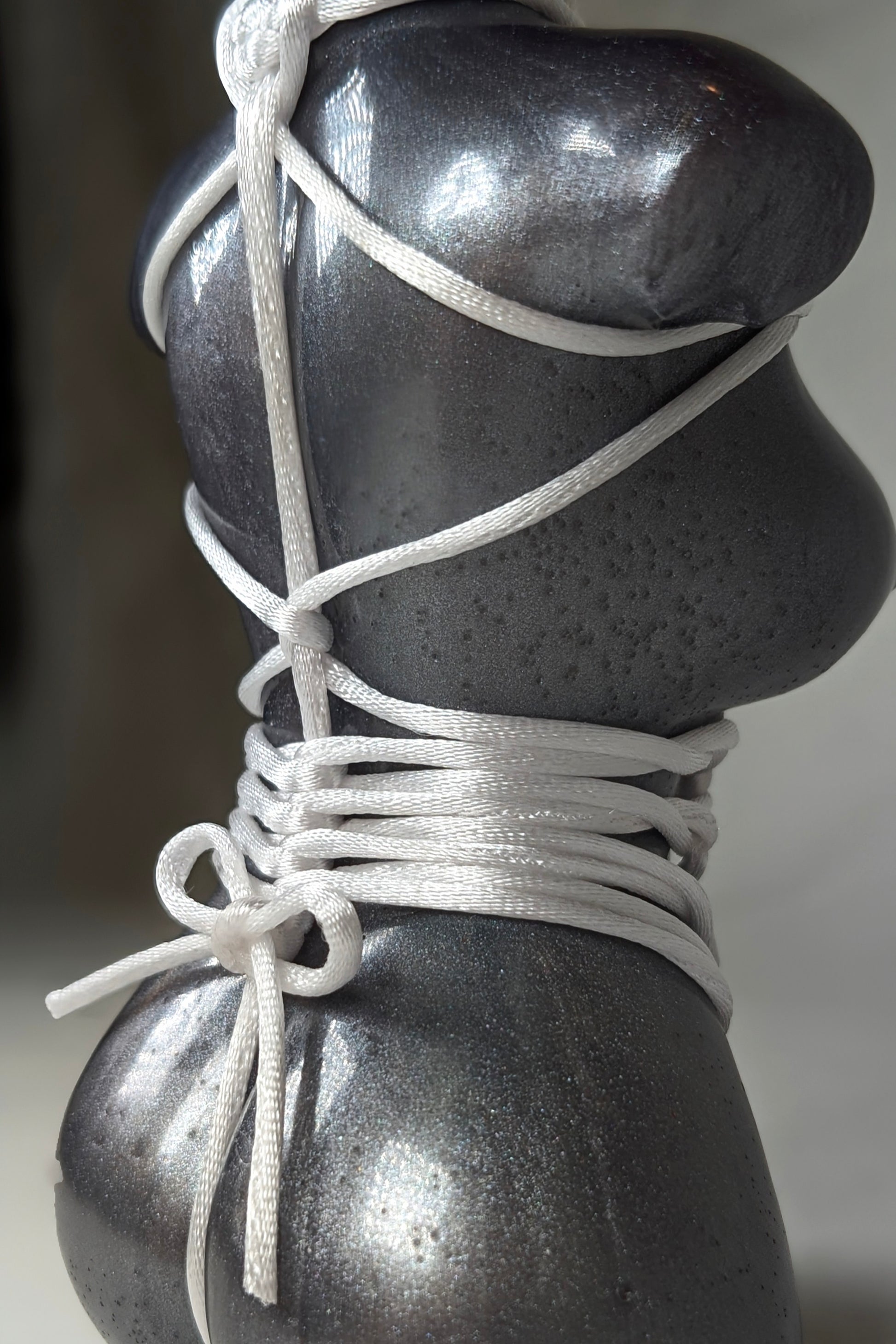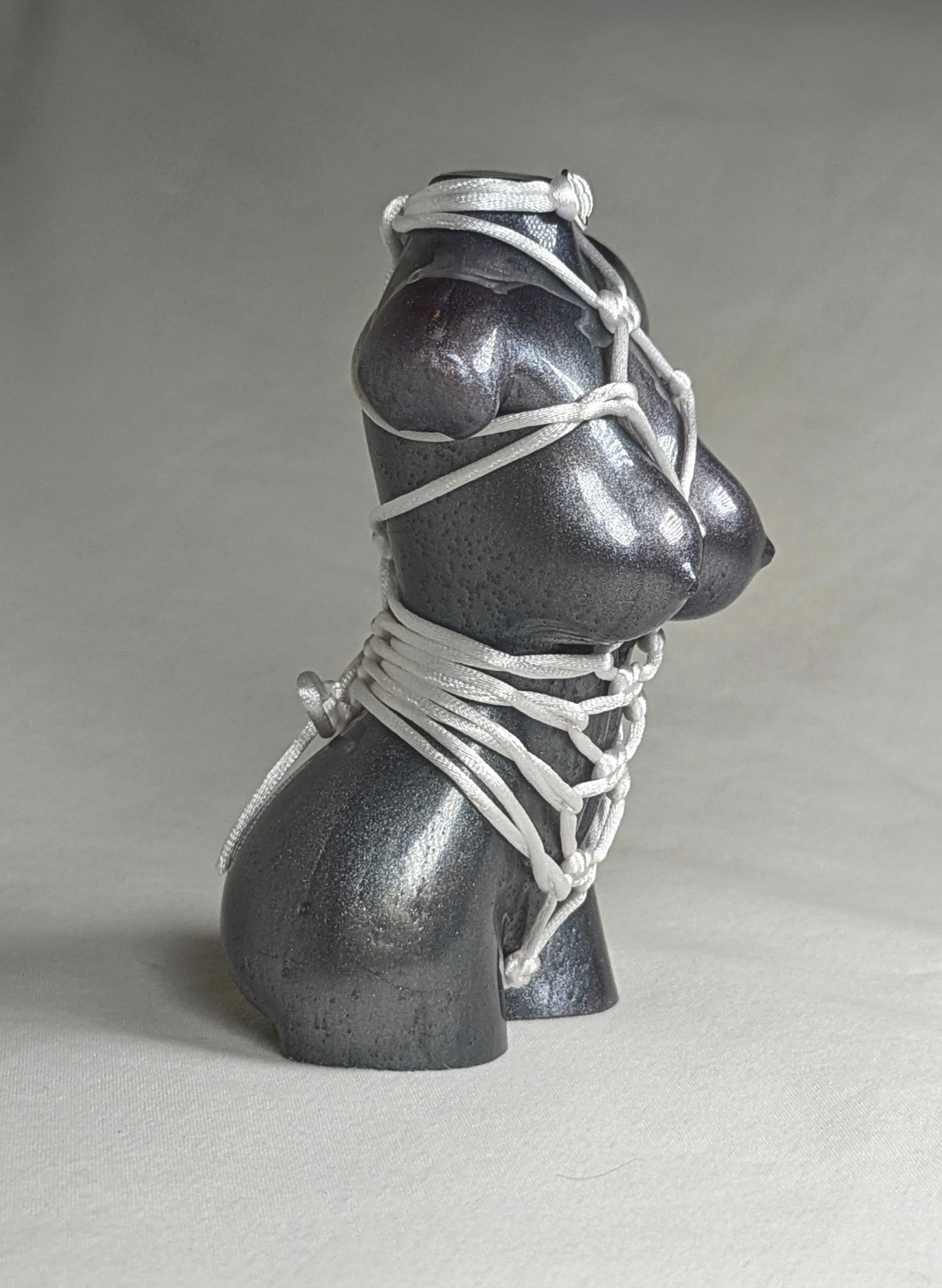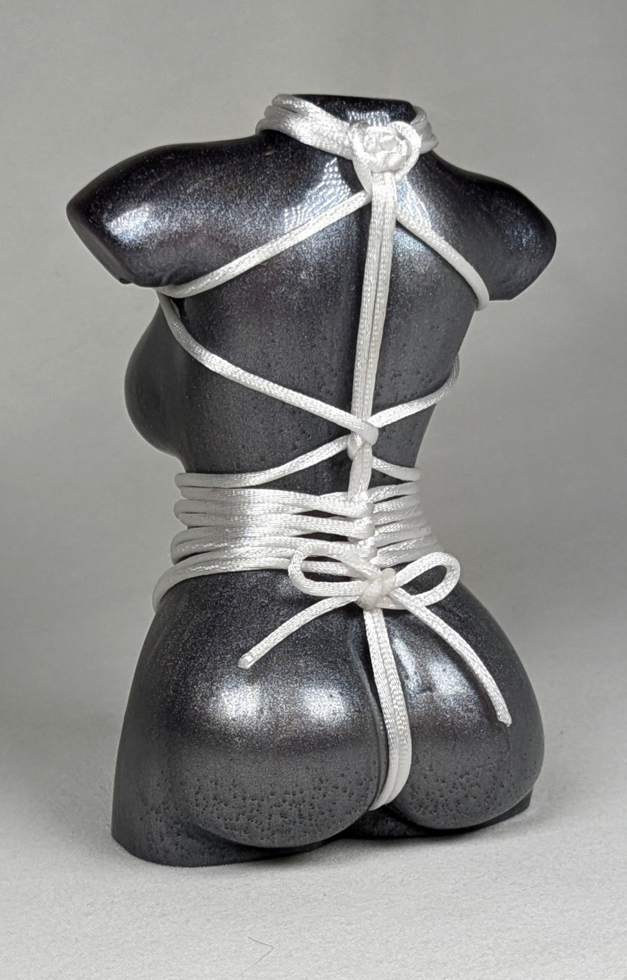 You can have your figurine tied in a decorative rope harness, or without rope to come as a nude, unbound torso. If you would like a bound figurine, there are currently 13 rope color options, and the ties now come with my signature decorative rope ring collars. If you do NOT want it to come tied with the rope collar, check the box.